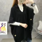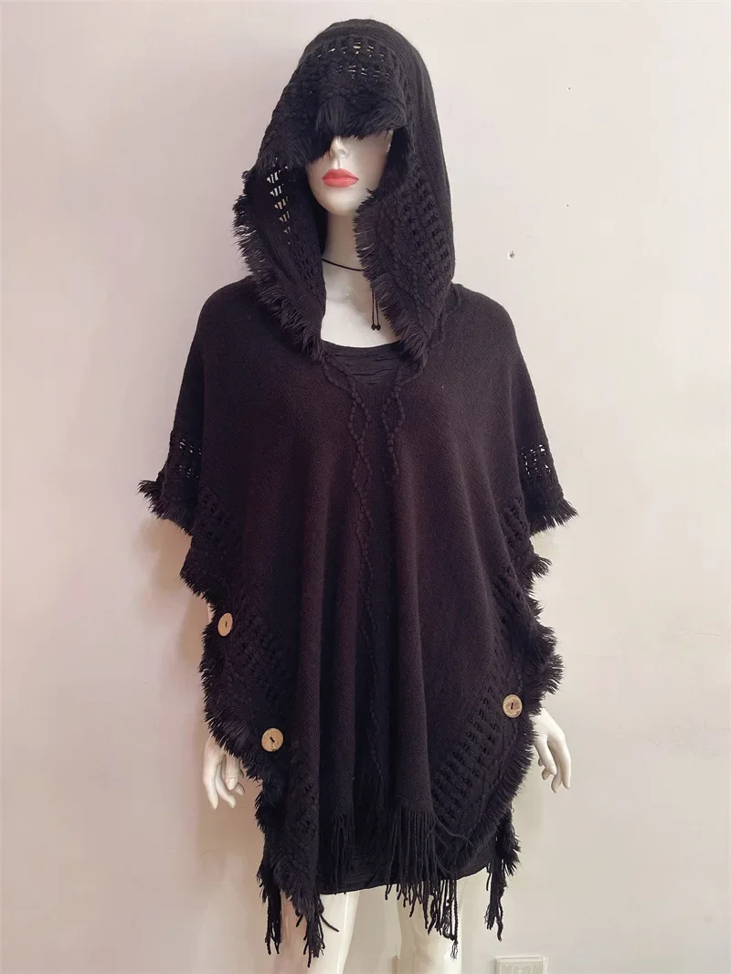 Cape poncho tricotée d’hiver avec boucle et ourlet asymétrique.